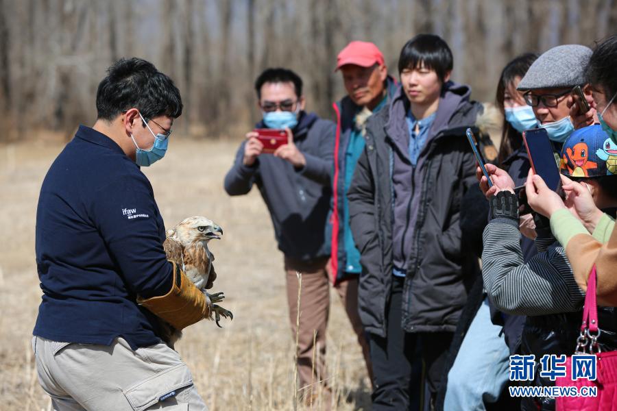 3月20日,北京猛禽救助中心猛禽康復(fù)師周蕾在放飛大鵟前向參加放飛活動的人員進行講解、展示。新華社記者 李京 攝