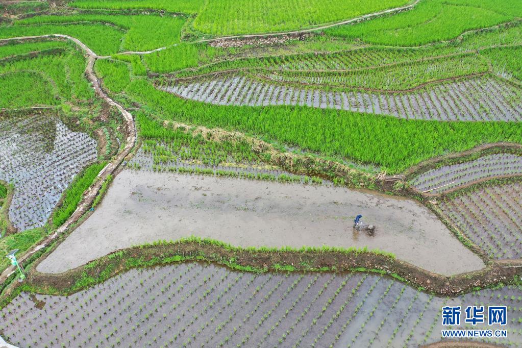 4月5日,村民在浙江省麗水市景寧畬族自治縣大漈鄉(xiāng)梯田里翻耕,以備種植茭苗(無人機(jī)照片)。