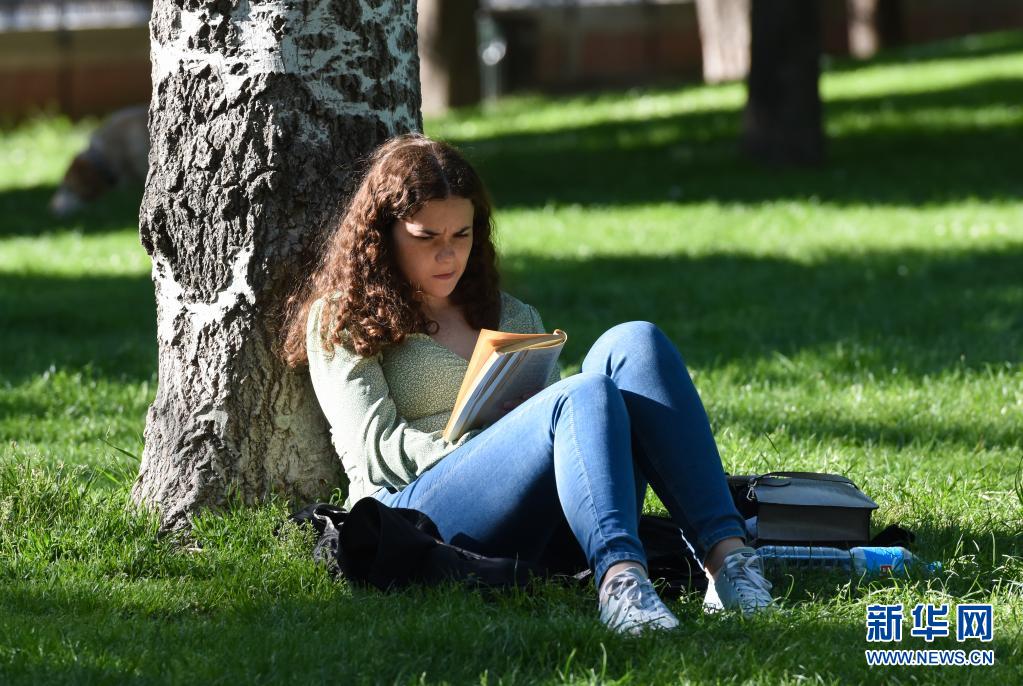 4月16日,一名女子在西班牙馬德里一個(gè)公園內(nèi)讀書(shū)。