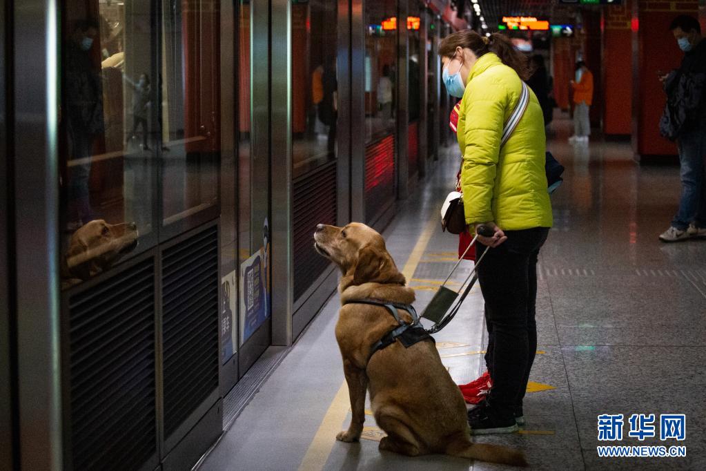導盲犬“多多”陪伴祝愛葉在地鐵站內(nèi)準備乘坐地鐵(3月13日攝)?! ⌒氯A社發(fā) (張夢 攝)