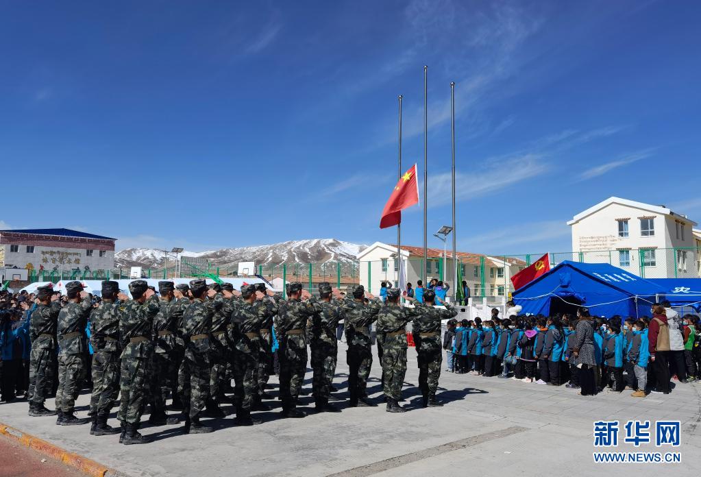 5月24日,武警青海總隊(duì)果洛支隊(duì)機(jī)動(dòng)大隊(duì)官兵與花石峽鎮(zhèn)藏文中心寄宿制小學(xué)的師生一同參加升國(guó)旗儀式。新華社發(fā)(宦爵才郎 攝)