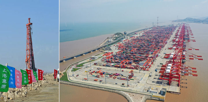 拼版照片:左图为2014年12月23日,上海洋山港四期工程打下第一桩(新华社发);右图为2022年9月23日无人机拍摄的上海洋山港四期集装箱码头(新华社记者丁汀摄)。