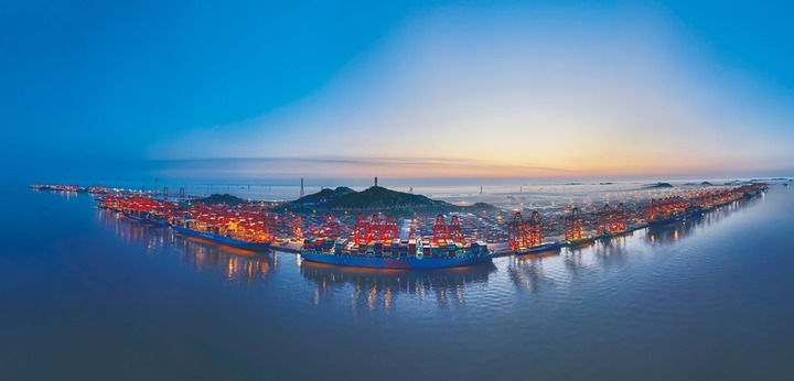 洋山港犹如一面征帆,引向航运智能化、绿色化发展的方向,勇立开放共荣的潮头。