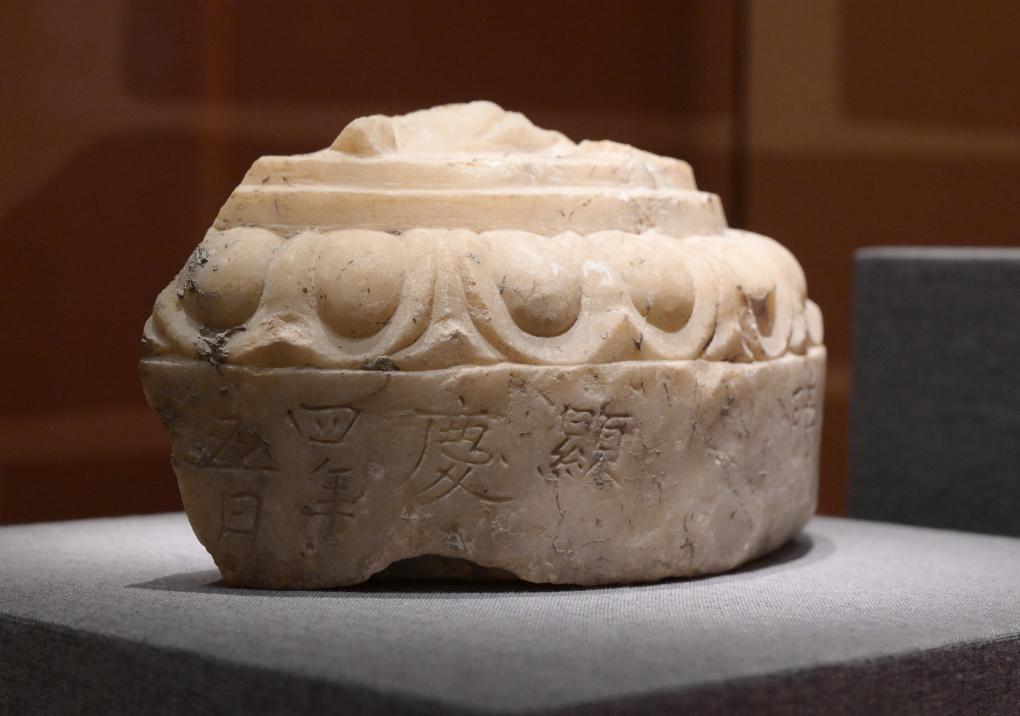 这是一件刻有“显庆四年五月”字样的唐代汉白玉莲花座残件(7月28日摄)。
