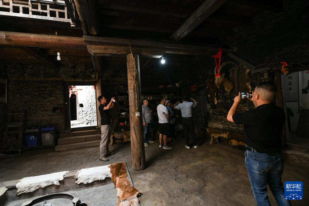 游客在桃坪羌寨的碉房内部参观(9月13日摄)。