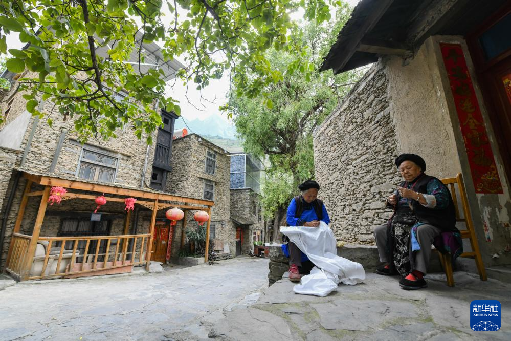 9月13日,羌族阿妈在自家房屋前做针线活。