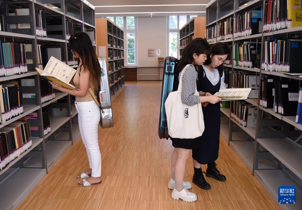 9月13日,中国留学生黄韵瑜(右)、黄韵文(中)、王嘉曦在维也纳国立音乐与表演艺术大学图书馆阅览。