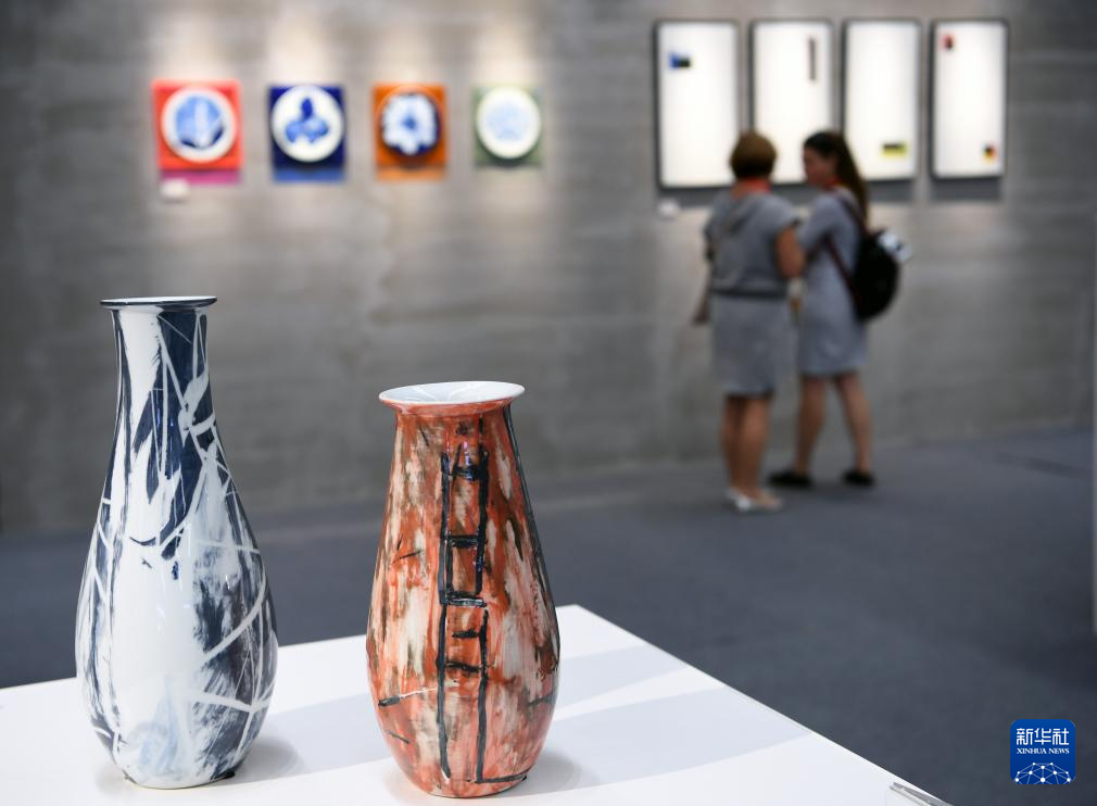 10月18日,两名外国参观者在瓷博会上欣赏陶瓷艺术品。