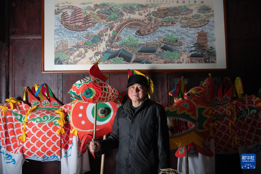 1月6日,在安徽省黄山市歙县北岸镇瞻淇村,瞻淇鱼灯非遗传承人汪观海在家中展示自己制作的鱼灯。