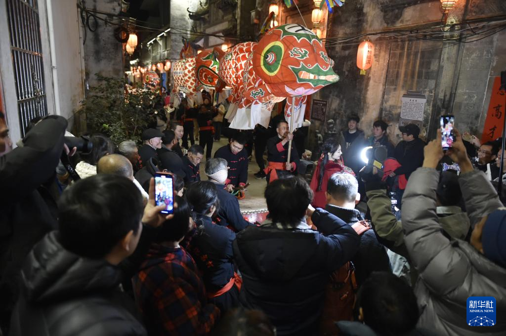 1月8日晚,安徽省黄山市歙县北岸镇瞻淇村鱼灯队在村里表演。