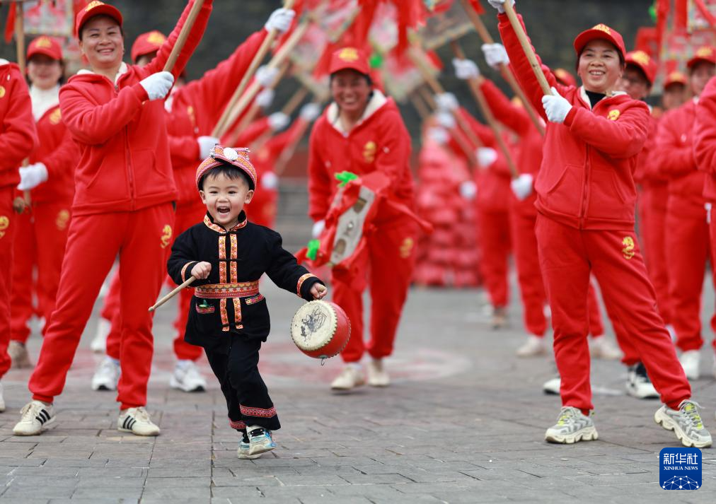 1月21日,民间艺人在湖北省襄阳市唐城景区表演舞蹈。