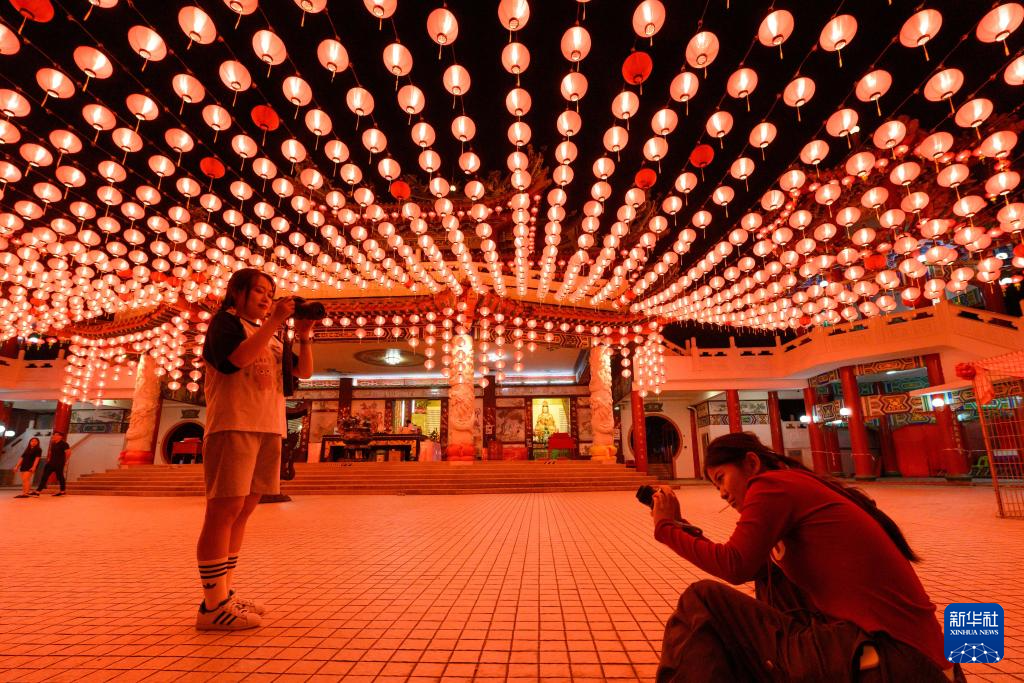 1月21日,在马来西亚首都吉隆坡的天后宫,参观者拍摄节日彩灯。