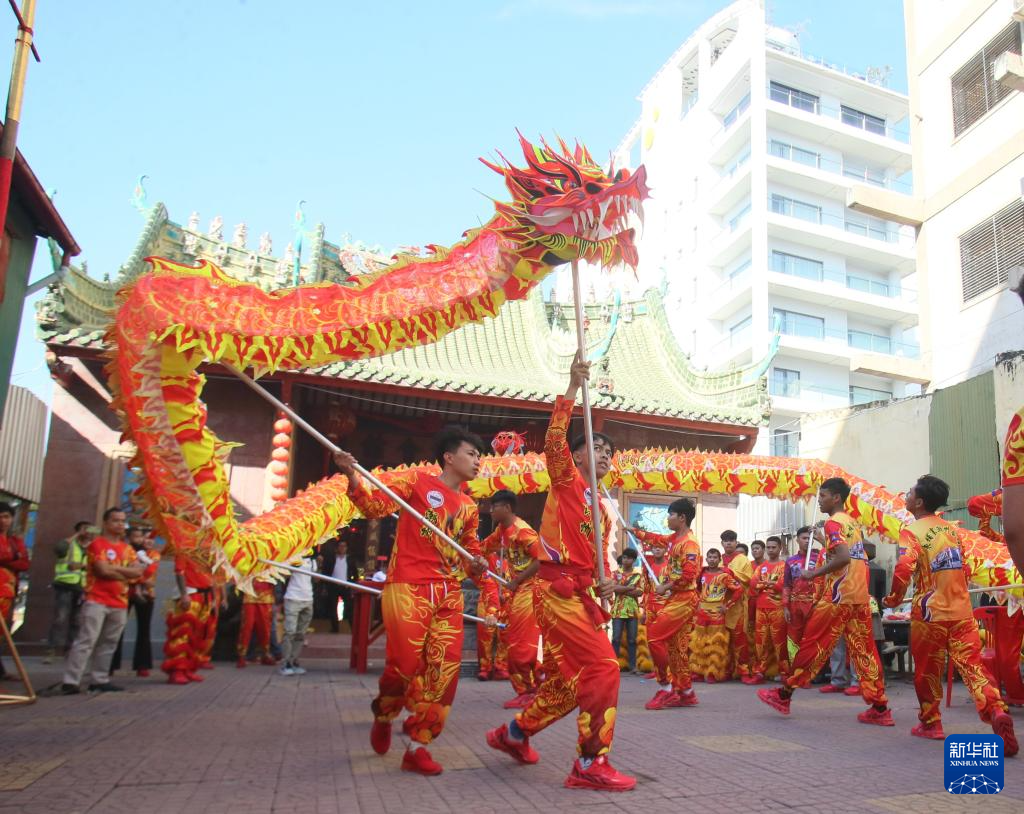 1月14日,表演者在柬埔寨首都金边的潮州会馆内舞龙。