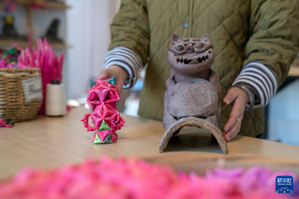 1月25日,杨洁在工作室展示一款造型为瓦猫的菱角编制作品。
