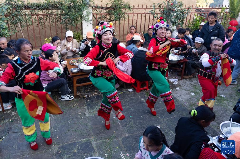 鲁丽华(中)在南涧彝族自治县宝华镇拥政村一农户家的婚礼上表演跳菜(2025年2月7日摄)。