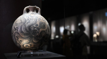 4月16日,非遗传承人在2025哈尔滨市开江民俗文化周启动仪式现场展示用鱼皮、桦树皮和秸秆制作的作品。