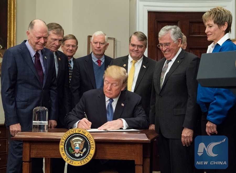 Photo released by NASA on Dec. 11, 2017 shows U.S. President Donald Trump (front) signing the Space Policy Directive 1 at the White House in Washington D.C., the United States, on Dec. 11, 2017. (Xinhua/NASA/Aubrey Gemignani)