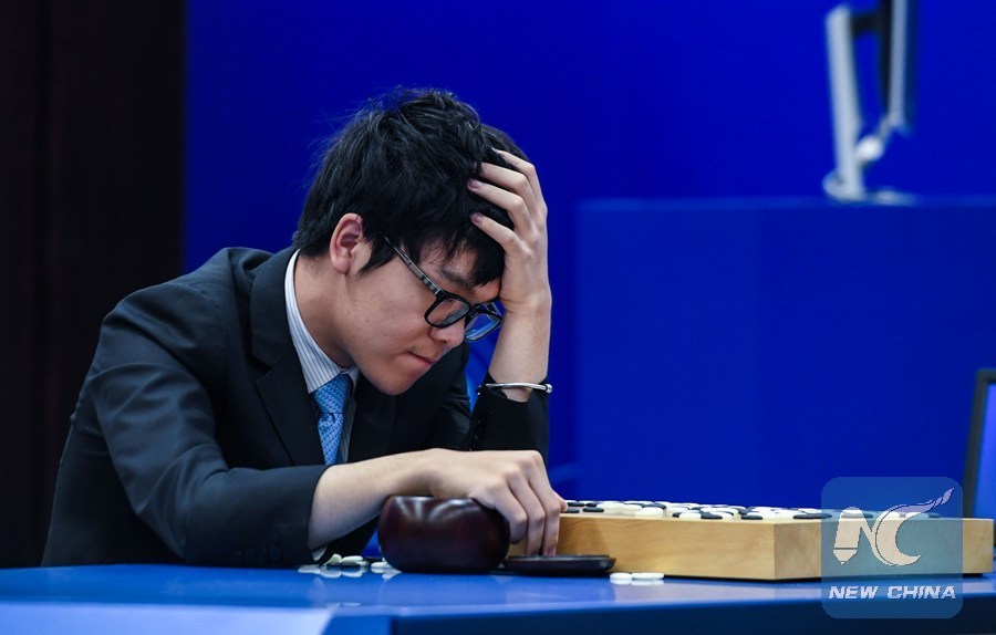 Chinese Go player Ke Jie analyses the game after the second match against artificial intelligence program AlphaGo in Wuzhen, east China's Zhejiang province, May 25, 2017. (Xinhua/Xu Yu)