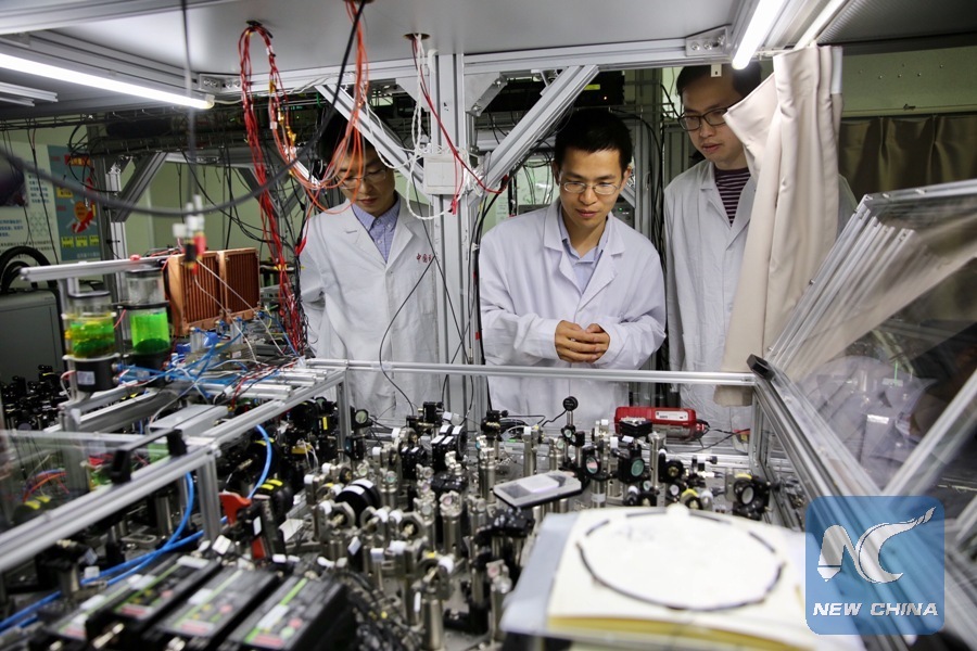 Professor Lu Chaoyang (C) of the University of Science and Technology of China checks the operating status of the quantum computing machine with his students at a lab in Shanghai, east China, May 3, 2017. Chinese scientists have built the world's first quantum computing machine that goes far beyond the early classical -- or conventional -- computers, paving the way to the ultimate realization of quantum computing. (Xinhua/Jin Liwang)