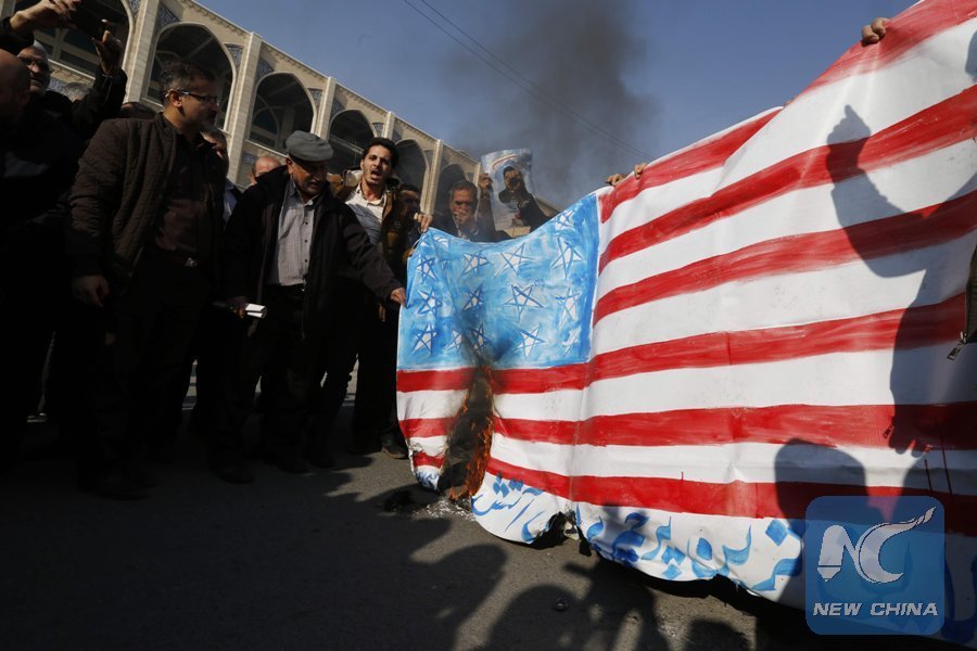 Iranian pro-government demonstrators set a makeshift U.S. flag on fire during a march after the weekly Muslim Friday prayers in Tehran on Jan. 5, 2018. (AFP Photo)