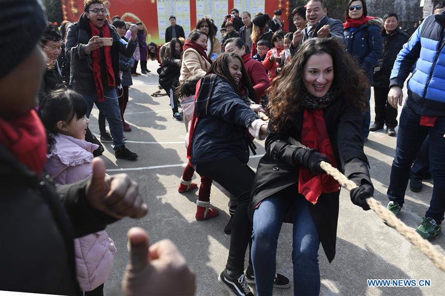 Foreigners participate in a tug of war at Mingyan Village, Ningbo City of east China's Zhejiang Province, Feb. 4, 2018. About 100 foreigners greet the Chinese lunar New Year by experiencing folk customs in Ningbo. (Xinhua/Huang Zongzhi)