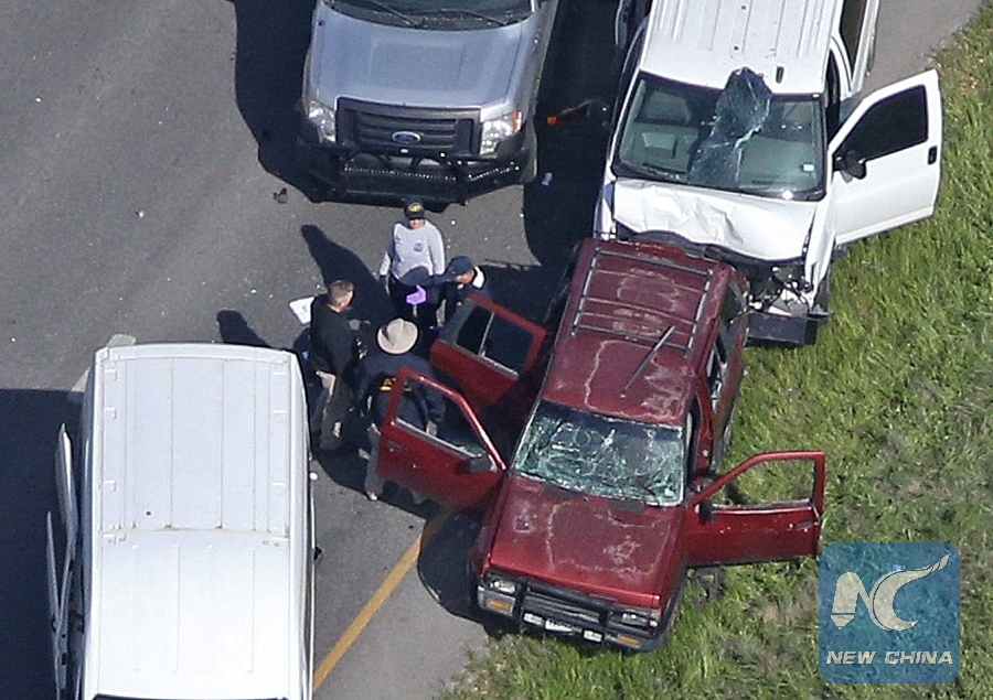 Law enforcement personnel investigate the scene where the Texas bombing suspect blew himself up on the side of a highway north of Austin in Round Rock, Texas, U.S., March 21, 2018. (Xinhua/REUTERS)