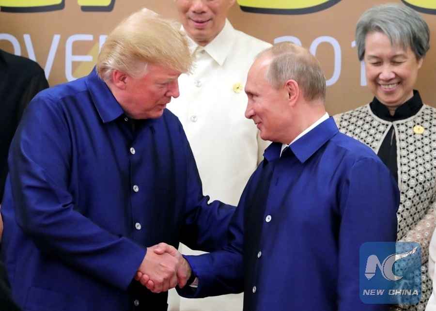 U.S. President Donald Trump and Russian President Vladimir Putin shake hands as they take part in a family photo at the APEC summit in Danang, Vietnam, Nov. 10, 2017. (Xinhua/REUTERS)