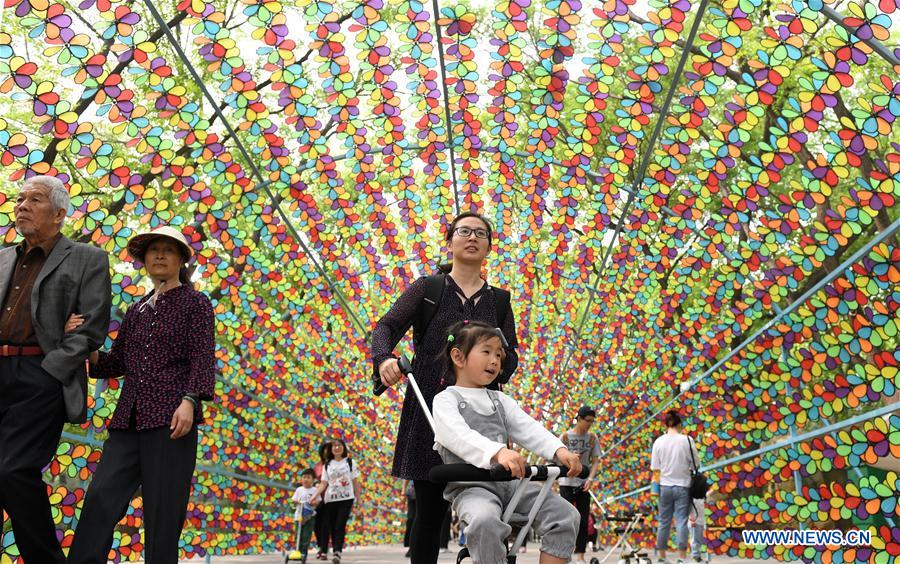 Tourists visit a pinwheels' avenue in Shijingshan Amusement Park during a spring fete in Beijing, capital of China, April 29, 2018. The fete, decorated by various pinwheels, kicked off on April 29, 2018. (Xinhua/Li Jundong)