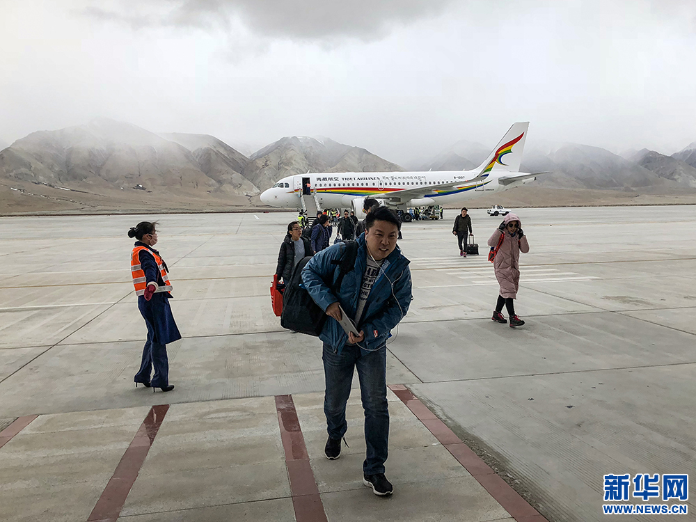 Passengers get off the airplane and walk into the terminal of the Ali Kunsha Airport, Ali Prefecture, southwest China's Tibet Autonomous Region, May 8, 2018. (Xinhuanet/Xue Zhen)