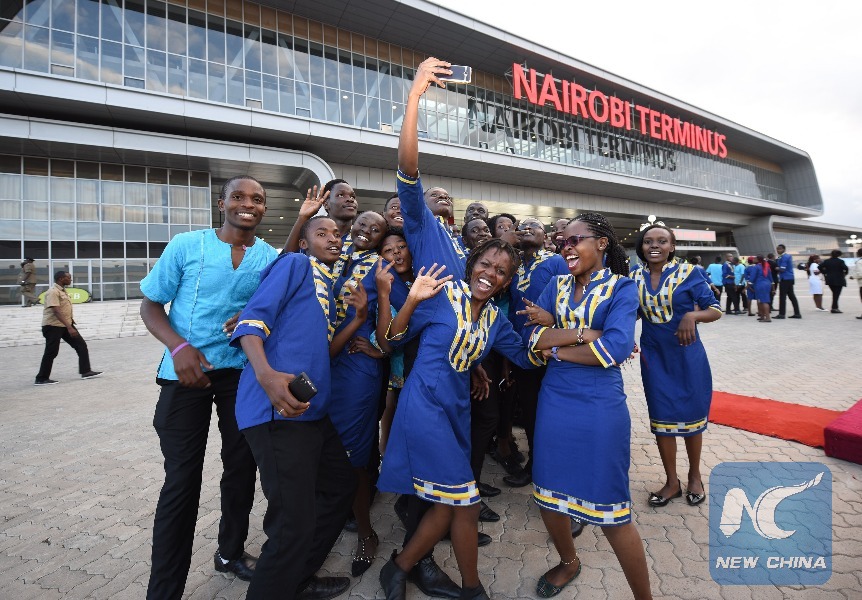 Performers pose for photos at Nairobi Terminus of Mombasa-Nairobi Standard Gauge Railway in Nairobi, capital of Kenya, May 31, 2017. (Xinhua/Chen Cheng)