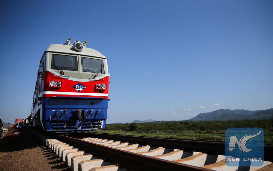 A locomotive is seen at a construction site of the Standard Gauge Railway (SGR) project, near Sultan Halmud, Kenya, on May 28, 2016. Kenyan President Uhuru Kenyatta said Saturday China-funded high speed railway which runs from the coastal city of Mombasa to Nairobi will be completed ahead of the schedule. (Xinhua/Pan Siwei)