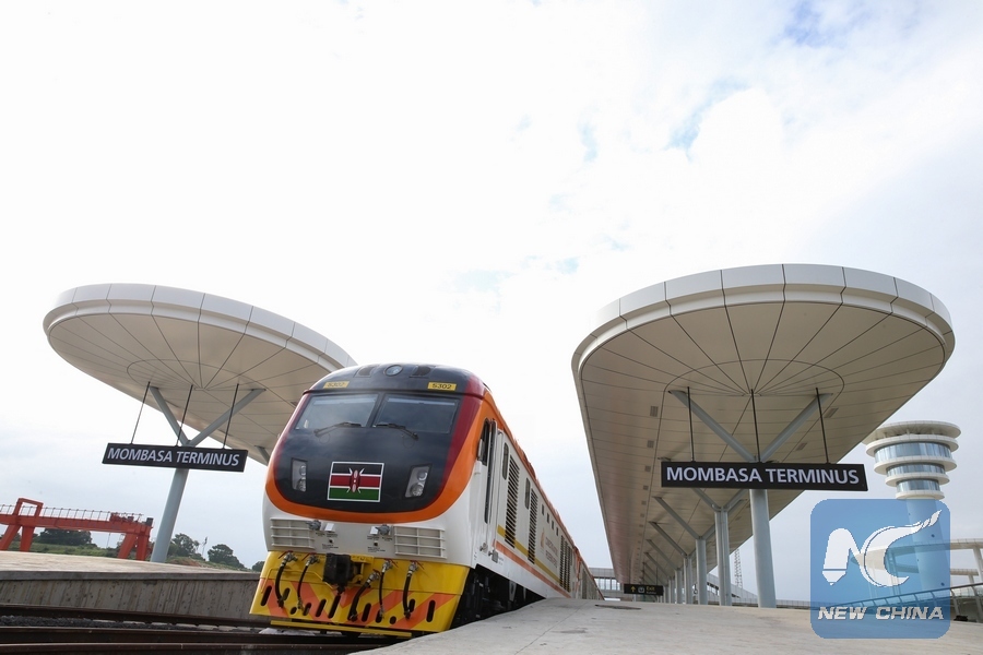 A train is seen at Mombasa Terminus of Mombasa-Nairobi Standard Gauge Railway, in Kenya, on June 1, 2017. Kenyan President Uhuru Kenyatta on Wednesday launched the passenger train service of the 480-km Mombasa-Nairobi Standard Gauge Railway (SGR), paving way for the nation's endeavor for industrialization and prosperity.