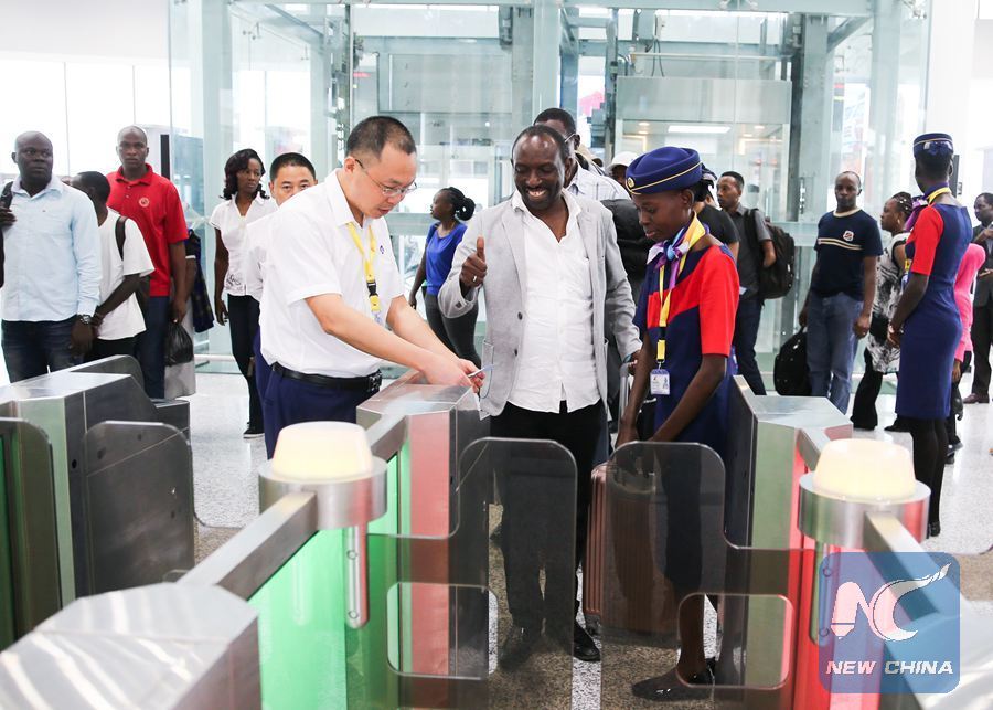 Chinese and Kenyan staff members guide a passenger to pass a fare gate at Mombasa Terminus of Mombasa-Nairobi Standard Gauge Railway, in Kenya, on June 1, 2017. (Xinhua/Pan Siwei)