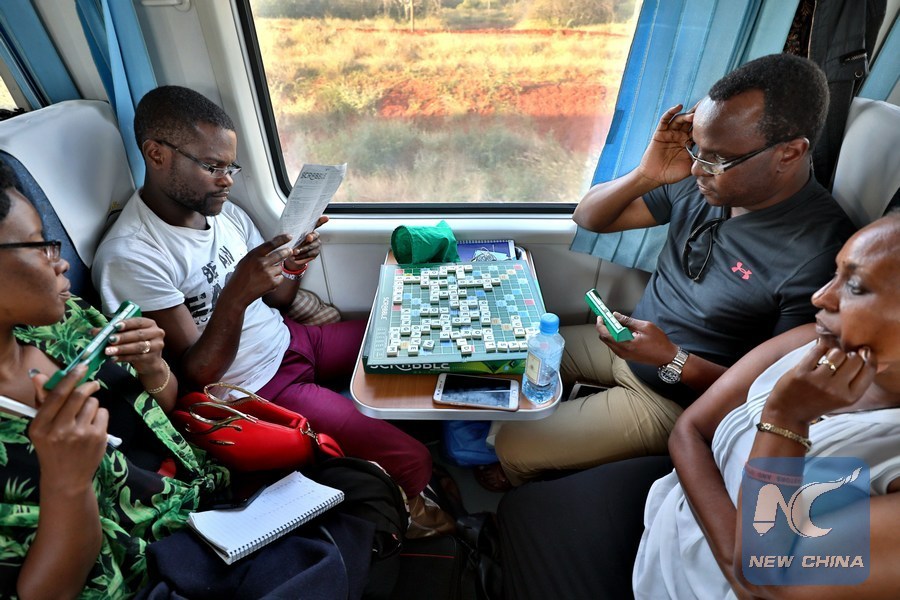 Passengers play scrabble on a train of Kenya's Mombasa-Nairobi Standard Gauge Railway (SGR), on June 2, 2018. The Chinese-built Mombasa-Nairobi SGR of some 480 kilometers has attained an occupancy rate of over 95 percent while reducing the time between Kenya's two biggest cities by half to five hours. An estimated 1.3 million Kenyans have commuted between Nairobi and Mombasa by the SGR train since its launch on May 31 last year. (Xinhua/Wang Teng)