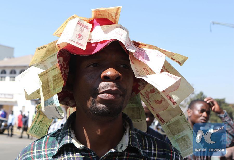 Zimbabwean demonstrator shows defunct local currency in downtown Harare, capital of Zimbabwe, Aug. 3, 2016. Hundreds of Zimbabwean protesters marched in the capital Harare to protest against the impending introduction of bond notes and lack of jobs. (Xinhua)
