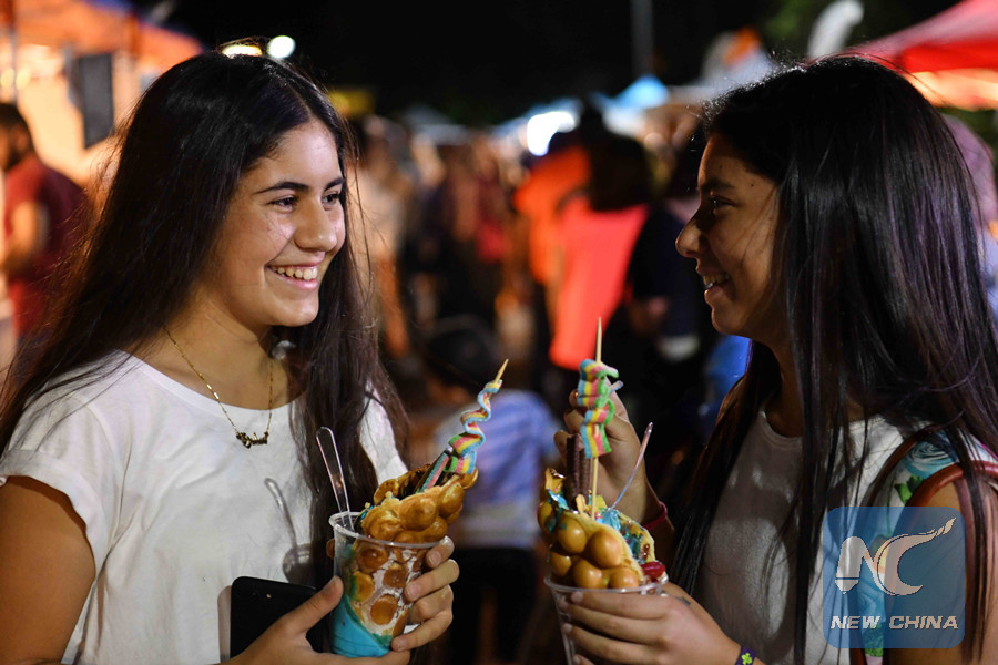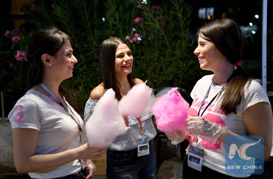 Young ladies enjoy their time eating cotton candies at a Food Street event in Syrian capital Damascus on July 19, 2018. (Xinhua/Ammar Safarjalani)