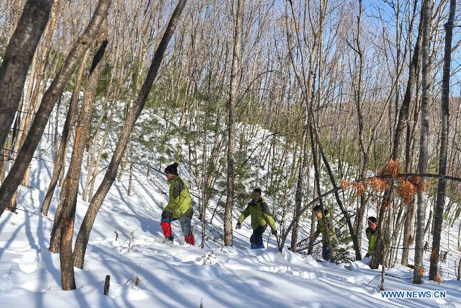 Rangers patrol in the forest of the Hunchun National Siberian Tiger Nature Reserve, northeast China's Jilin Province, Feb. 3, 2016. (Xinhua/Xu Chang)
