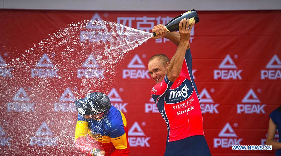 Winners celebrate at the award ceremony of the eighth stage of the Tour of Qinghai Lake in northwest China's Gansu Province on July 29, 2018. (Xinhuanet Photo by Yang Shoude)