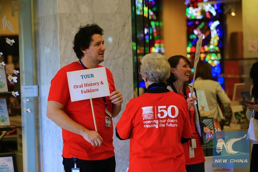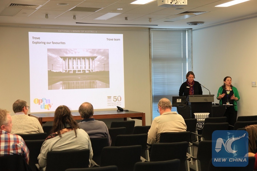 Volunteers give a free lecture for visitors at the National Library of Australia in Canberra, Australia, on Aug. 12, 2018. (Xinhua/Pan Xiangyue)