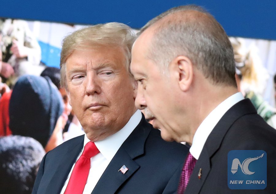In this file photo taken on July 11, 2018, U.S. President Donald Trump (L) talks to Turkey's President Recep Tayyip Erdogan (R) as they arrive for the NATO summit, at the NATO headquarters in Brussels. (Xinhua/AFP)