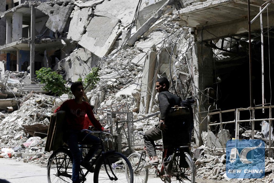 Syrians cycle along a damaged street in Douma on the outskirts of Damascus on April 16, 2018 during an organised media tour after the Syrian army declared that all anti-regime forces have left Eastern Ghouta, following a blistering two month offensive on the rebel enclave. (AFP Photo)