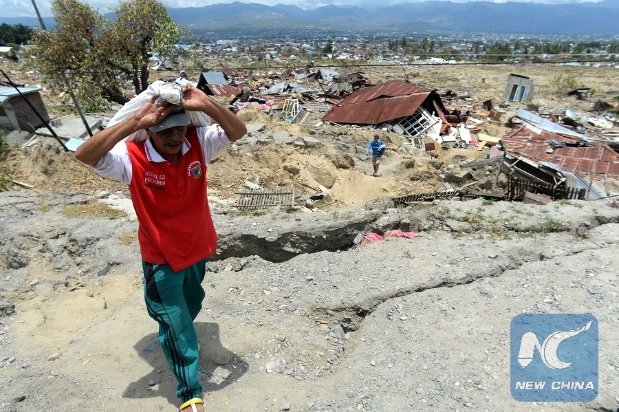 A man looks for salvageable items among the debris at Balaroa, Palu, Central Sulawesi, Indonesia, Oct. 7, 2018. (Xinhua/Agung Kuncahya B.)