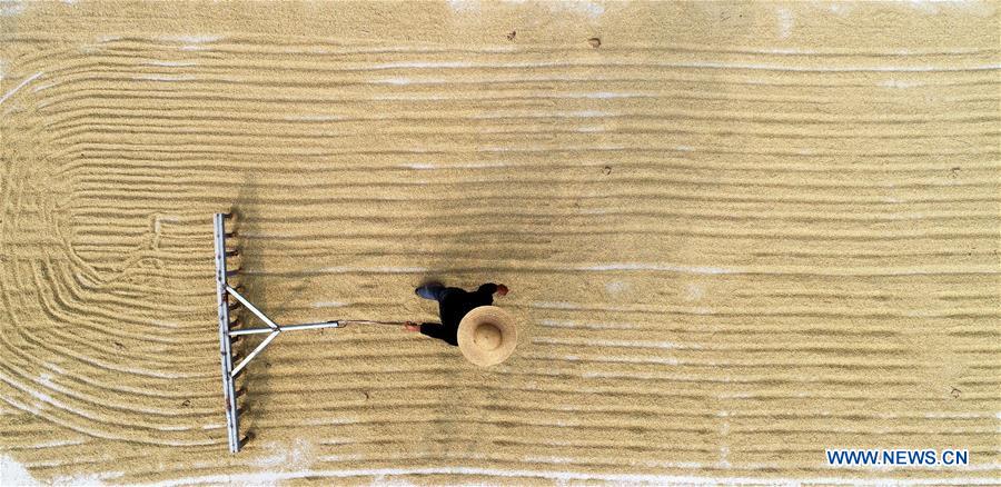Aerial photo taken on Oct. 16, 2018 shows villagers stir rice grains for drying in Tancheng County of Linyi, east China's Shandong Province. World Food Day is celebrated every year on Oct. 16 to commemorate the founding of the UN Food and Agriculture Organization in 1945. (Xinhua/Zhang Chunlei)