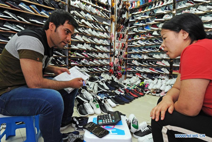 A Pakistani businessman purchases shoes at a shop within the Yiwu International Trade City in Yiwu, east China's Zhejiang Province, on Sept. 12, 2018. In the first three quarters of 2018, Zhejiang's total import and export values reached 2.11 trillion yuan (304.64 billion U.S. dollars), growing by 12.5 percent year on year, with export up 9.7 percent, hitting 1.57 trillion yuan (226.67 billion dollars), and import up 21.4 percent, hitting 544.72 billion yuan (78.64 billion dollars) year on year respectively. (Xinhua/Tan Jin)?