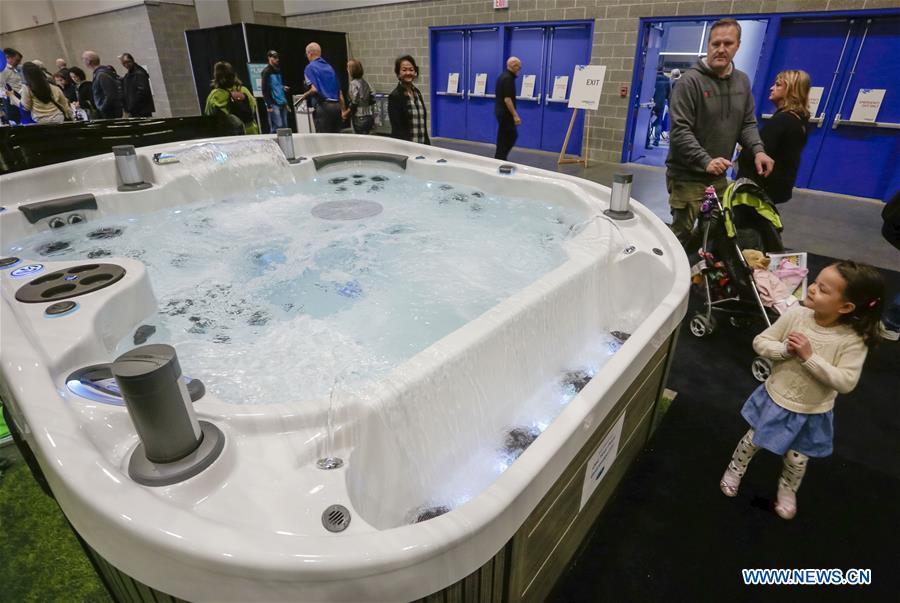 People look at an outdoor jacuzzi during the Vancouver Fall Home Show in Vancouver, Canada, on Oct. 20, 2018. A total of 325 exhibitors displayed the latest home renovations, DIY and interior designs during the four-day annual event. (Xinhua/Liang Sen)