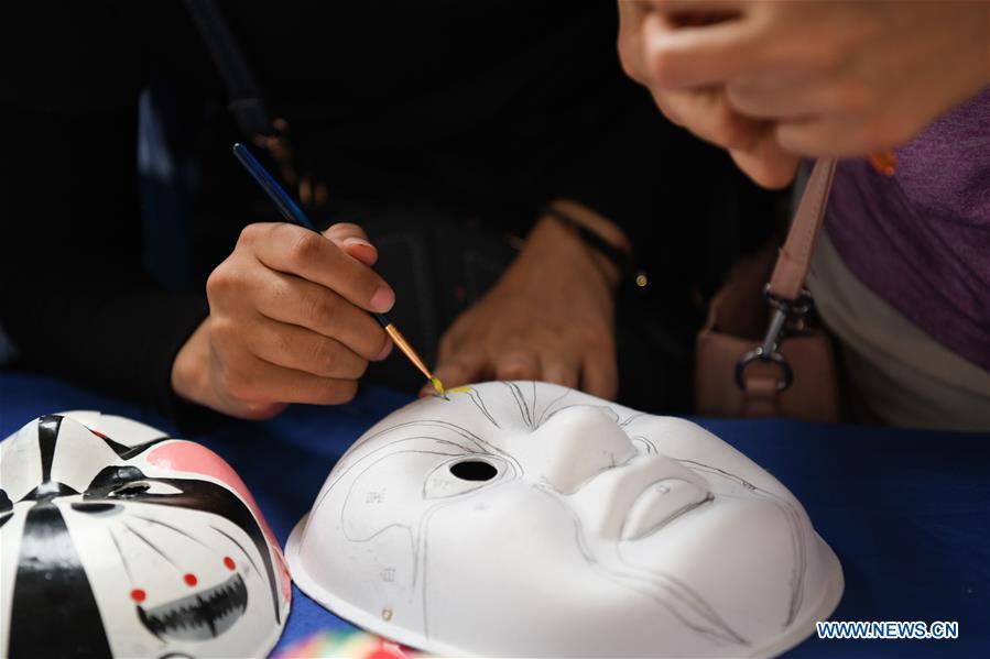 Students color the Chinese traditional masks at Suez Canal University in Ismailia, Egypt, on Oct. 23, 2018. The second edition of the Chinese Culture Day held by the Confucius Institute in Suez Canal University impressed the Egyptian students who gathered with eyes of admiration. (Xinhua/Wu Huiwo)