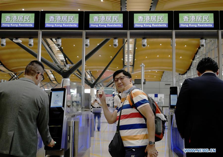 Passengers pass through the automatic channel in Hong Kong port of the Hong Kong-Zhuhai-Macao Bridge, in Hong Kong, south China, Oct. 24, 2018. The Hong Kong-Zhuhai-Macao bridge, the world's longest cross-sea bridge, opened to public traffic at 9 a.m. Wednesday. (Xinhua/Wang Shen)