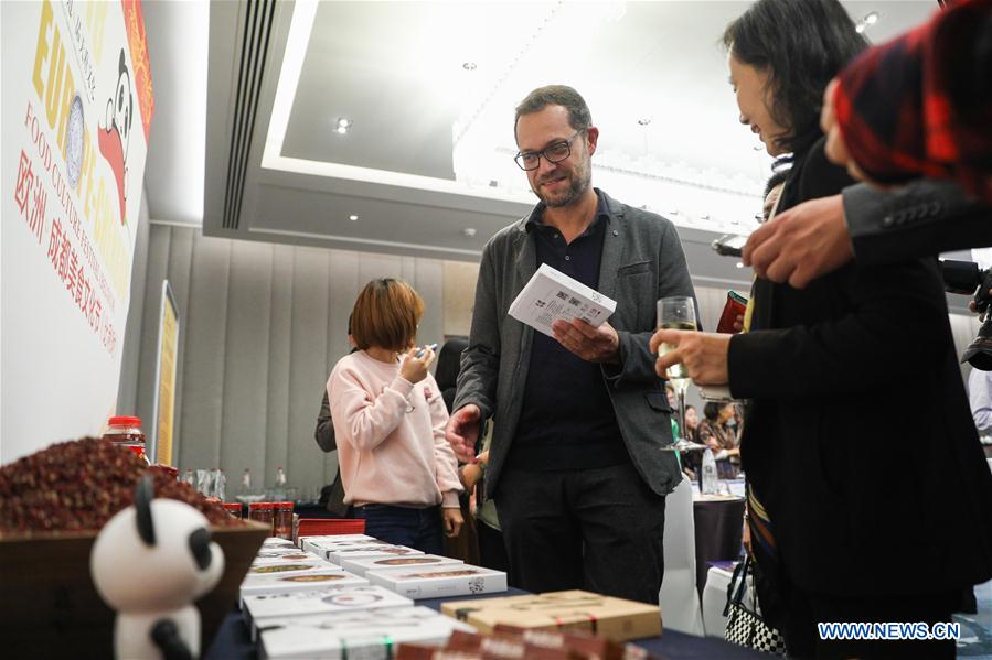 A guest visits 2018 Europe-Chengdu Food Culture Festival in Brussels, Belgium, on Oct. 24, 2018. The festival is aimed to show the culture and image of Chengdu, capital of southwest China's Sichuan Province, and to enhance the cooperation between China and Europe. (Xinhua/Zheng Huansong)