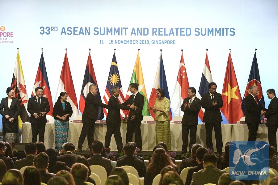 SINGAPORE, Nov. 12 (Xinhua) -- Trade ministers of the Association of Southeast Asian Nations (ASEAN) member states signed an agreement on e-commerce on Monday, encouraging paperless trading between businesses and governments of the bloc to generate rapid and efficient transactions.
