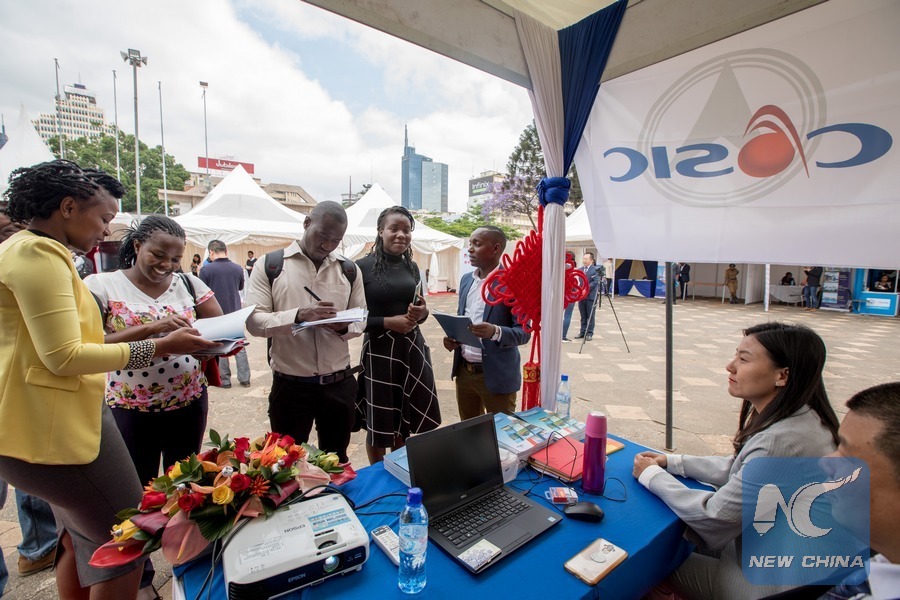 Job applicants visit a stand at a career fair of Chinese companies in Nairobi, Kenya, on Oct. 29, 2018. An organization of Chinese companies in Kenya on Monday opened a career fair here offering more than 1,000 job opportunities to Kenyans. (Xinhua/Zhang Yu)